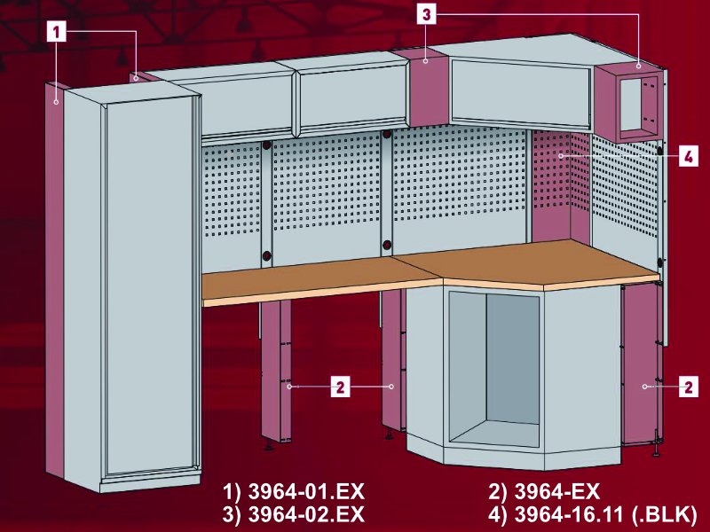 - pracovní stůl, systém skříněk MOBILIO - volně stojící konstrukce pro velmi flexibilní instalaci - zásuvky různých výšek, uloženy na kuličkových ložiscích - s centrálním zamykáním, včetně pojistek u jednotlivých zásuvek - pro výbavu KRAFTWERK COMPLETO / EVA / EVA3 - stěnové panely s EURO perforací - pracovní deska INOX tl. 38 obsahuje: - 1x skříňka spodní 2 dveře 680x458x910mm - 1x skříňka spodní 5 zásuvek 680x458x910mm - 1x skříňka spodní s odpadkovým košem 680x458x910mm - 1x skříňka spodní 9 zásuvek 680x458x910mm - 1x skříňka spodní rohová, 1 dvířka, zamykatelná, 864x864x910mm - 2x deska INOX 2041x463x38mm - 1x deska INOX pro rohovou skříňku 3964-16 - 1x skříňka spodní 8 zásuvek 680x458x910mm