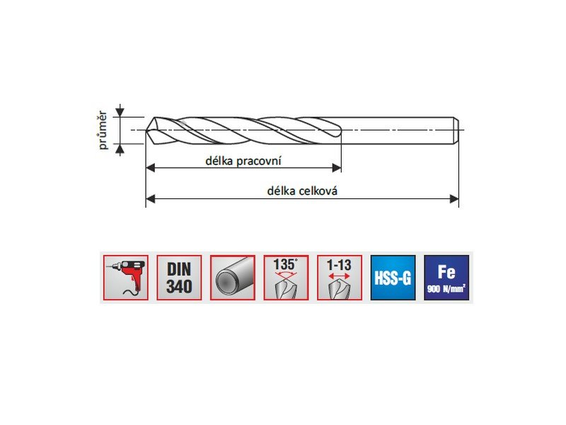 | Vrták do kovu 13,0x205/134mm vybrušovaný prodloužený HSS-G DIN340 |
