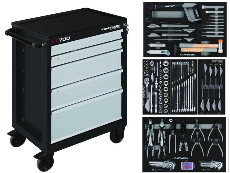 - 173 dílná základní sestava nářadí uložena ve 5 zásuvkách - 5 plně vybavených modulů nářadím řady Basic-Line - uloženo v pěnových EVA vložkách - dílenský vozík MADE IN GERMANY 5 zásuvek - velmi stabilní dvouplášťová konstrukce z ocelového plechu - 5 zásuvek s kuličkovými ložisky, plný výsuv - boční centrální zamykání všech zásuvek cylindrickým zámkem - se dvěma pevnými a otočnými koly