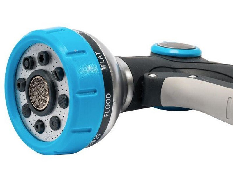 Kovový zahradní pistolový rostřikovač s pogumovanými prvky pro komfortní držení. Možnost regulace průtoku vody a aretace spouště. Nastavitelná tryska nabízí celkem 8 funkcí rozstřikování vody.
