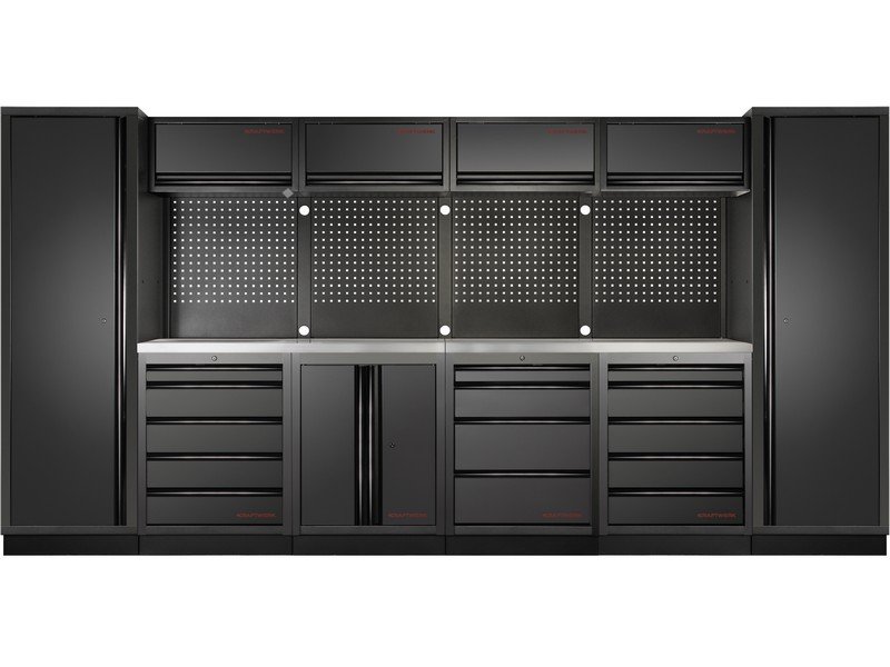 - modulární nástěnný systém skříněk MOBILIO BLACK - volně stojící konstrukce pro velmi flexibilní instalaci - zásuvky různých výšek, uloženy na kuličkových ložiscích - s centrálním zamykáním, včetně pojistek u jednotlivých zásuvek - provýbavu KRAFTWERK COMPLETO / EVA / EVA3 - stěnové panely s čtvercovými otvory - multiplex pracovní deska tl. 38 mm z nerezu, obsahuje: