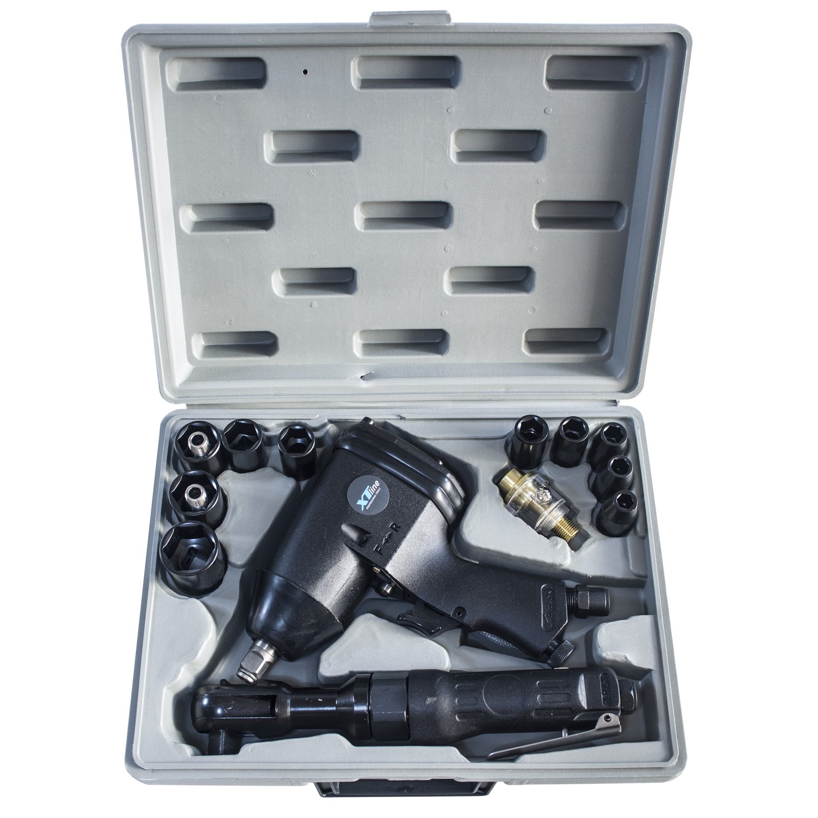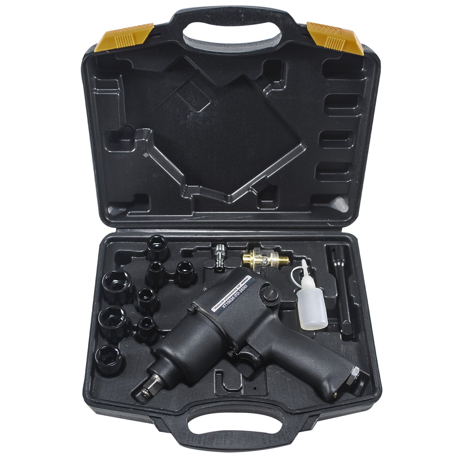 Výstupní čtyřhran 1/2", utahovací moment lze regulovat, uloženo s hlavičkami v plastovém kufru.